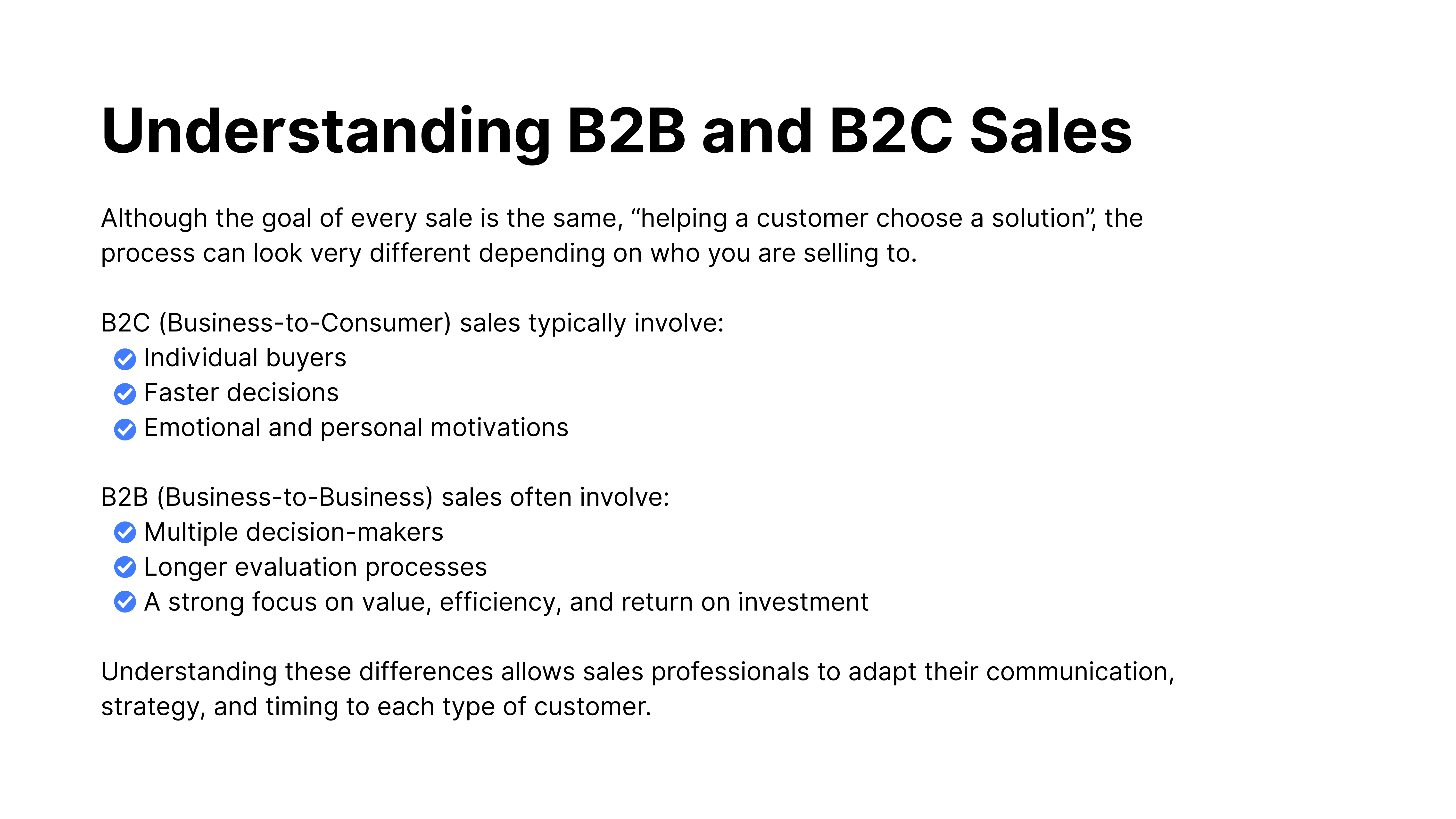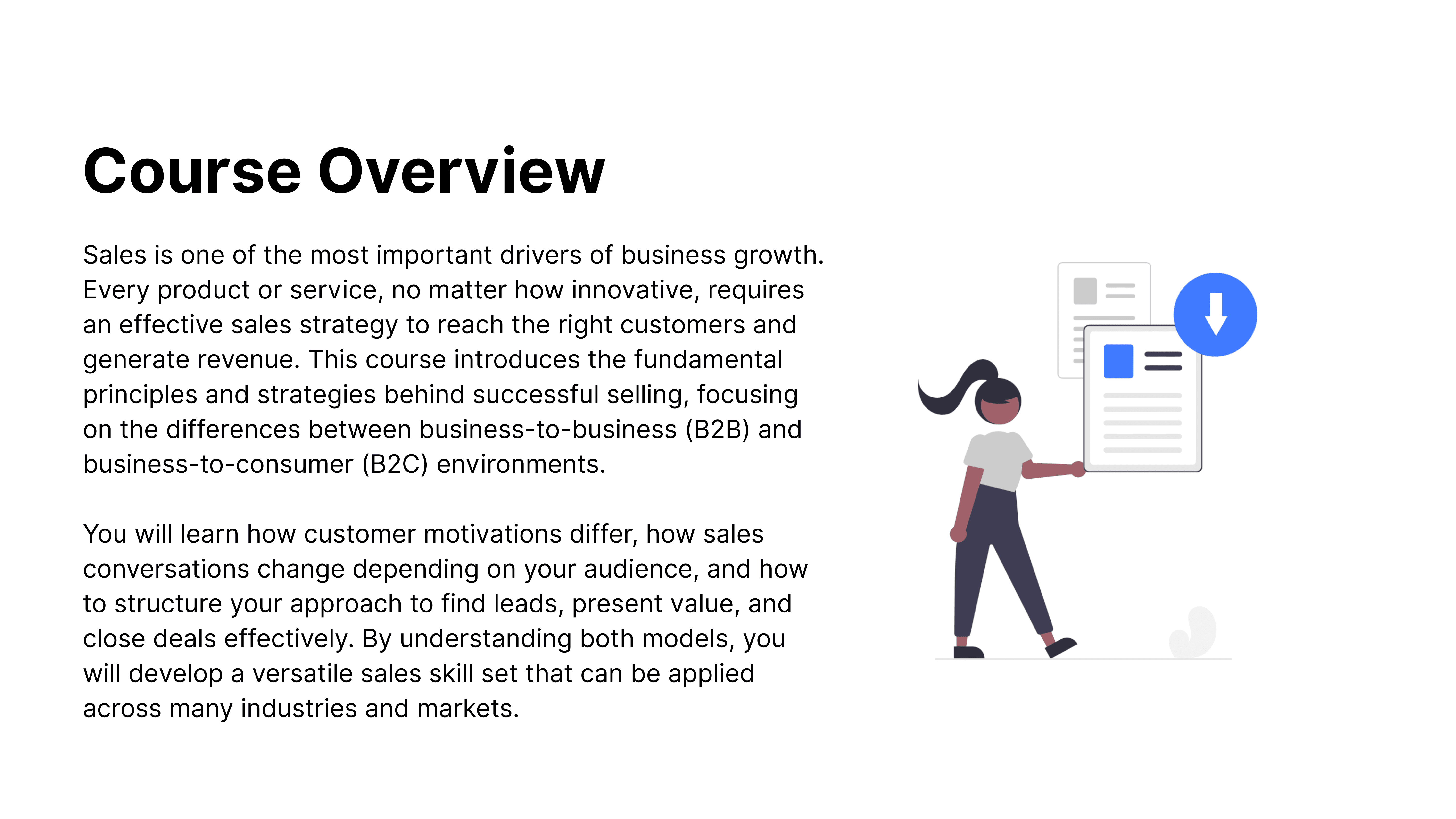Congratulations on recognizing that mastering sales is the lifeblood of every business! This course is your opportunity to move beyond theory and acquire the practical strategies that lead to real results. We’ll equip you with a powerful toolkit for both B2B and B2C environments, teaching you how to build rapport, overcome objections, and create value for any type of client. Get ready to transform the way you sell and accelerate your business's success.